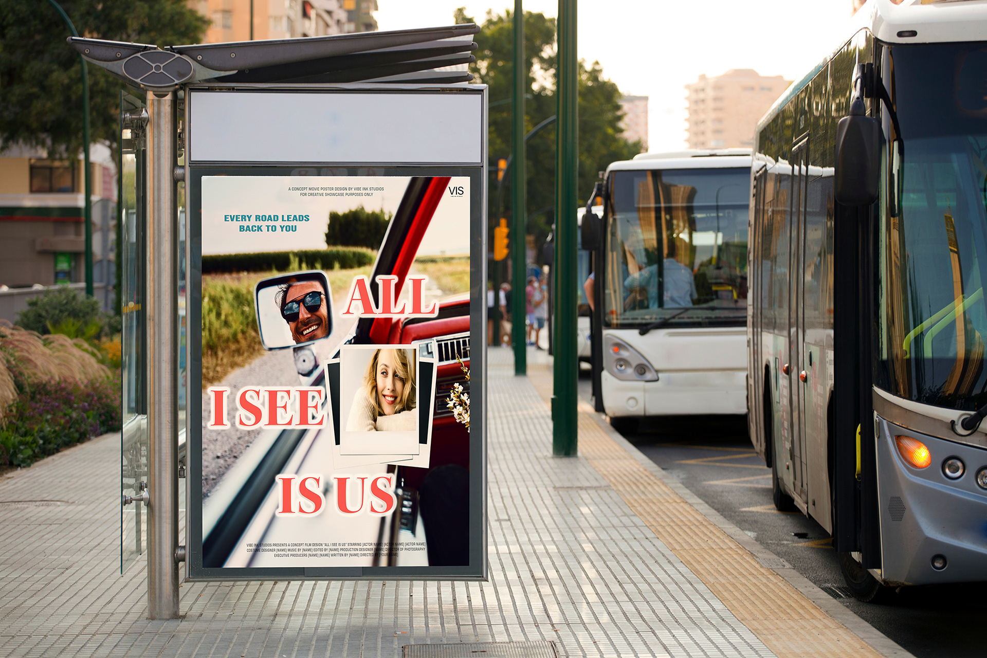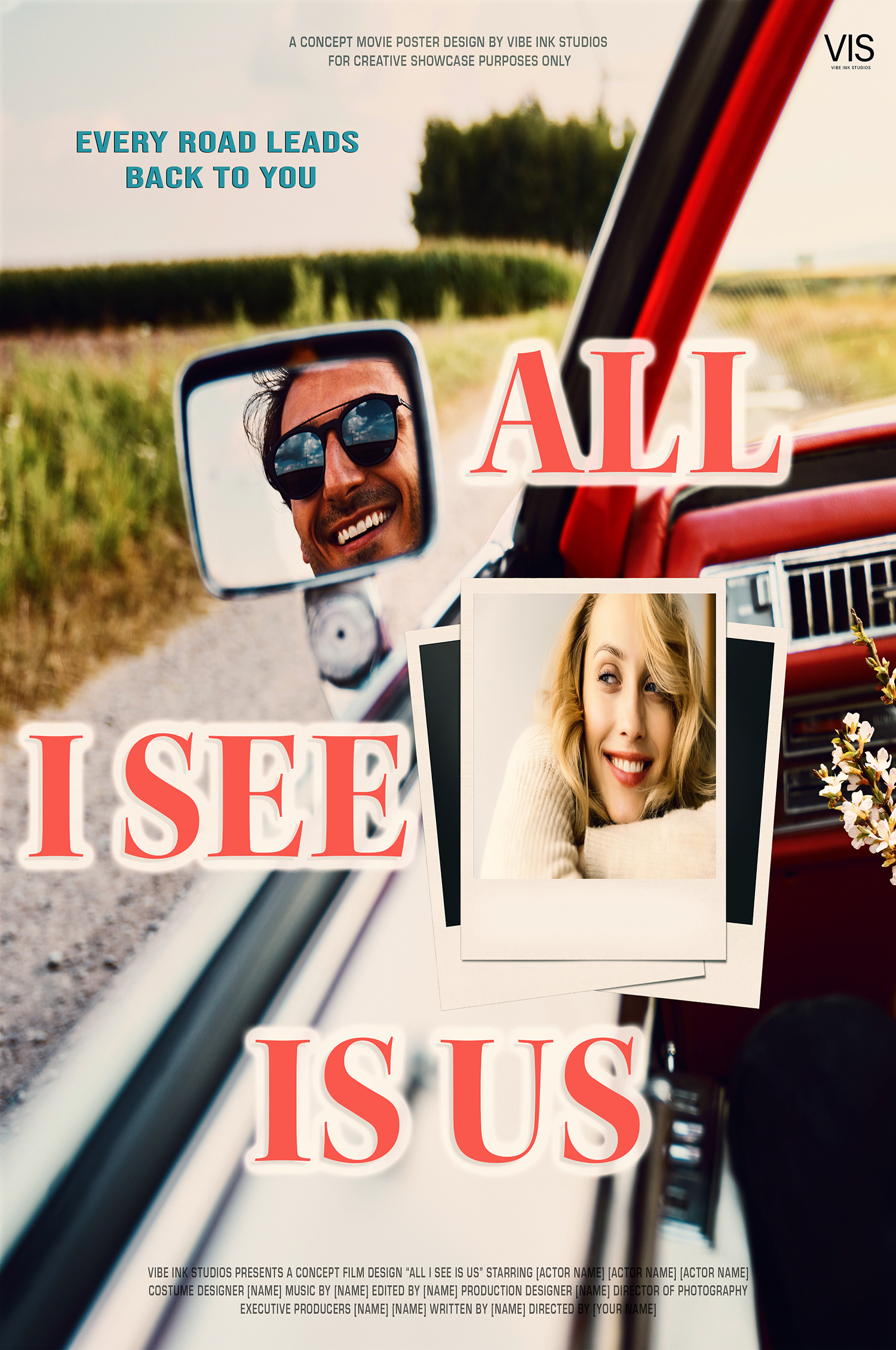 Title - this is where I thought deeply and finally came up with 'All I See is Us' it's about them, saying its all about Us, this felt like the perfect concept for a love story, travelling together, exploring their surroundings, driving a retro convertible classic car, maybe pink or red, something unique, that looks classic. I imagined the setting, somewhere in California, where the sun shines so bright and warm.